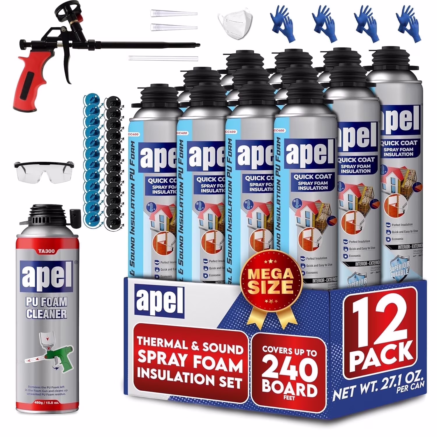 apel Spray Foam Insulation Kit (12 x 32.80 oz./240 Bd ft) Heat and Acoustic Insulation, Self Expanding Polyurethane Foam, Application Gun and Cleaner Included - 12 Pack