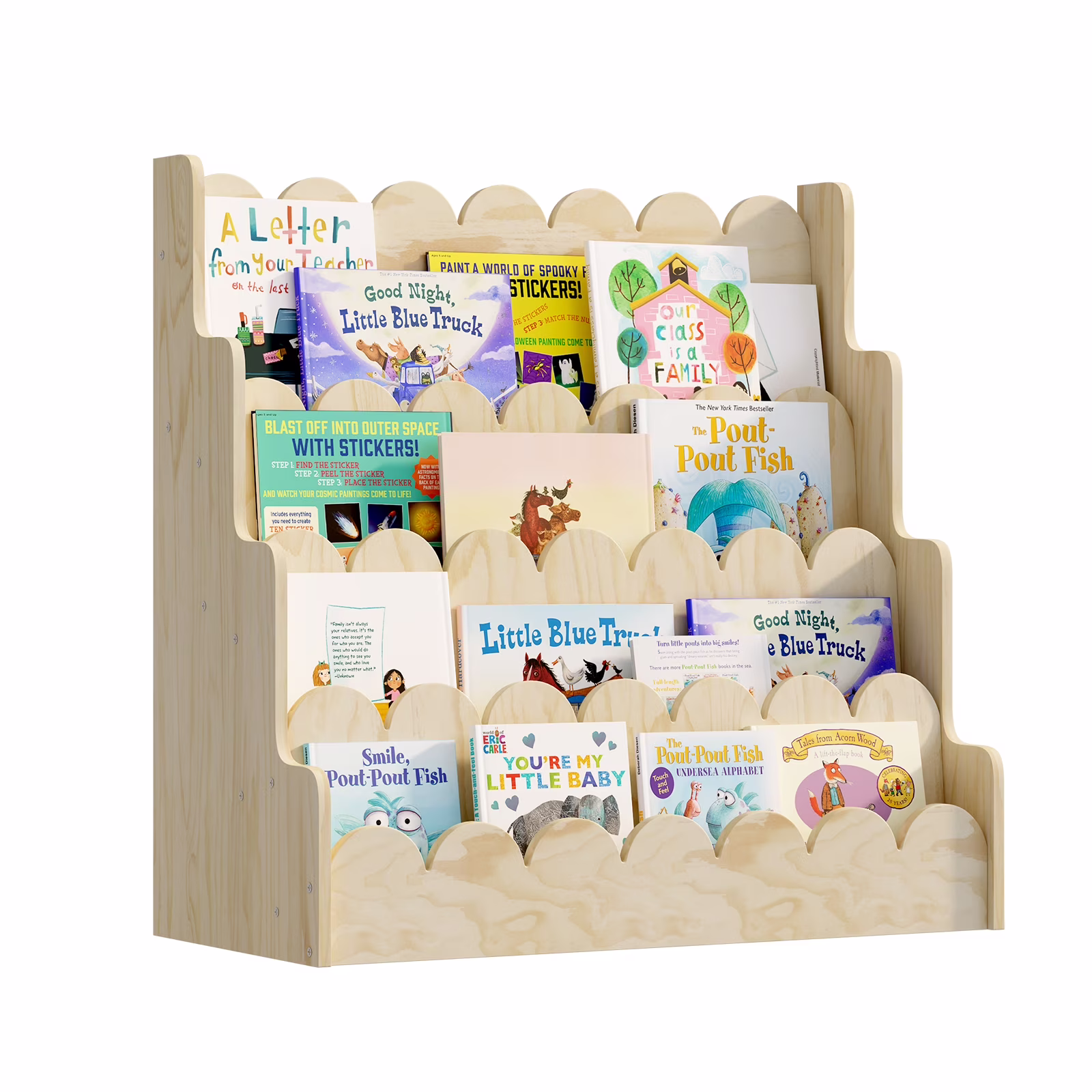 Montessori Wood Kids Bookshelf - Scalloped 4-Tier Front-Facing Book Display, Nursery Organizer for Toddler/Baby Books & Toys, Gender-Neutral Classroom Playroom Storage